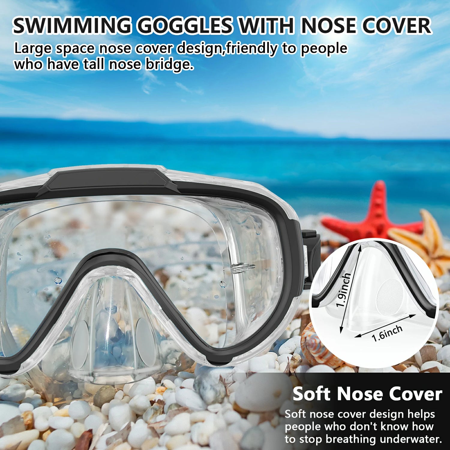 Norabidea swim goggles is with soft silicone skirt and nose cover, which is very comfortable to wear. The nose cover design is very helpful for those people who do not know how to stop breathing when underwater. And the nose cover is with enough room for people who have a tall nose bridge. By covering the nose, you don't have to worry choking underwater no matter for swimming, diving or snorkelling.